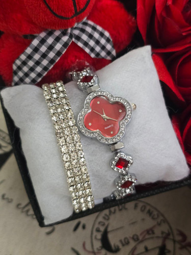 پک زنانه و دخترانه ساعت و دستبند و نیمست استیل و حلقه بهمراه باکس و عروسک و گل مصنوعی
