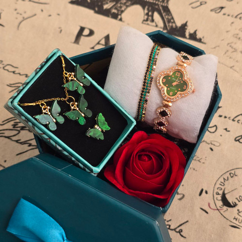 پک زنانه و دخترانه ساعت و دستبند و نیمست استیل و حلقه بهمراه باکس و گل مصنوعی