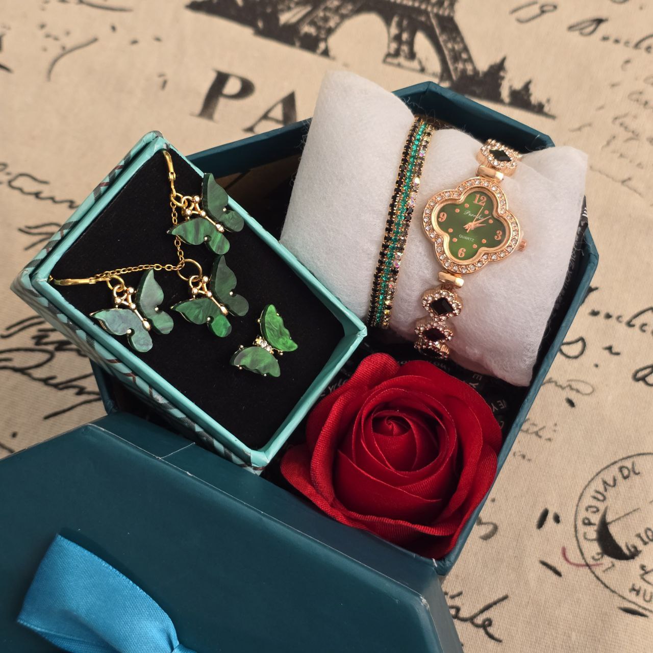 پک زنانه و دخترانه ساعت و دستبند و نیمست استیل و حلقه بهمراه باکس و گل مصنوعی