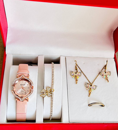 پک زنانه و دخترانه ساعت و دستبند و نیمست استیل و حلقه بهمراه باکس و گل مصنوعی