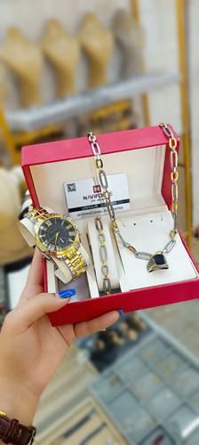ست زنانه و دخترانه ساعت و دستبند و نیمست استیل و حلقه بهمراه جعبه کادویی و باتری یدکی