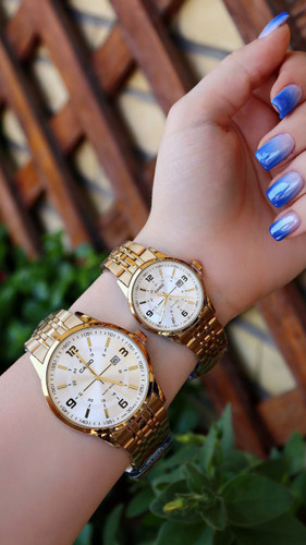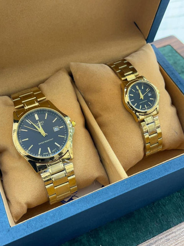 ست ساعت زنانه و مردانه کاسیو بند استیل ساعت ها دارای روزشمار دو عدد دستبند کارتیر استیل و دو تا انگشتر کارتیر (انگشتر طلایی و نقره ای و دورنگ موجود سایز ۶ تا ۱۰)