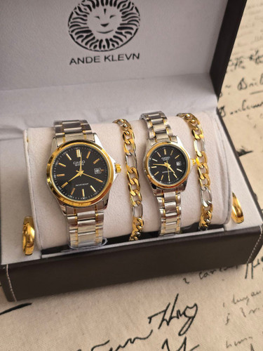 ست ساعت زنانه و مردانه برند Casio کاسیو ساعت ها دارای روزشمار دو عدد دستبند کارتیر استیل و دو تا اانگشتر به همراه جعبه کادویی