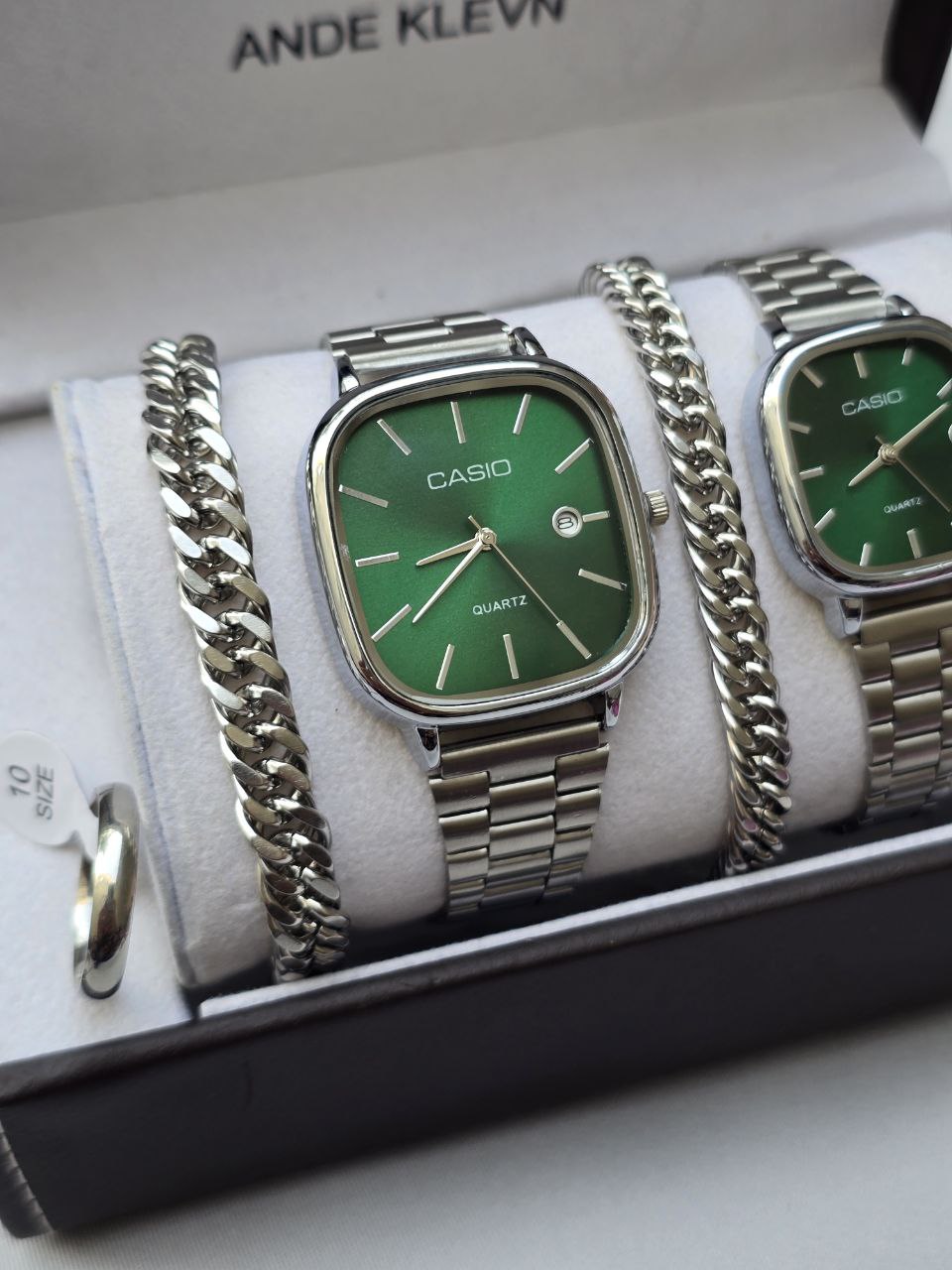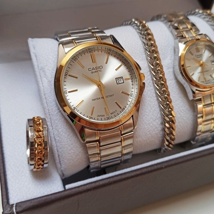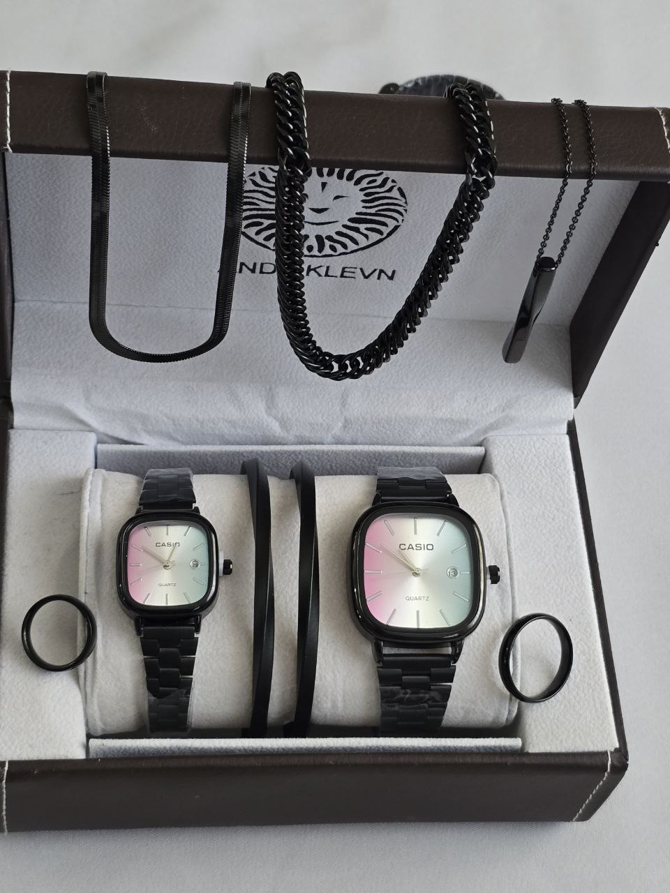 ست ساعت زنانه و مردانه برند Casio کاسیو ساعت ها دارای روزشمار دو عدد دستبند کارتیر استیل و دو تا اانگشتر به همراه جعبه کادویی