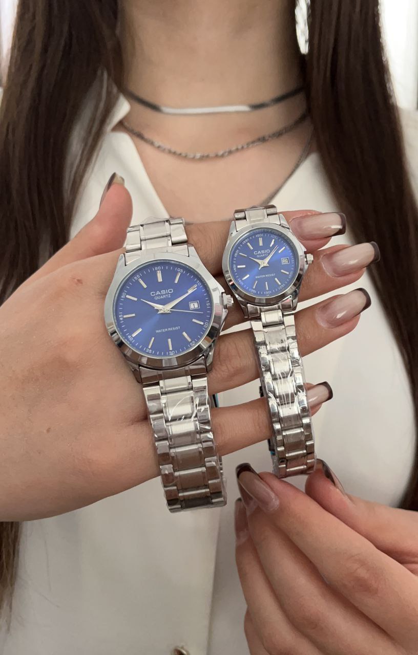 ست ساعت زنانه و مردانه برند کاسیو ☑️CASIO ☆☆☆☆ ▪︎high quality👌 >>ست کاسیو << قفل کلیپسی کیفیت سفارشی دارای روز شمار مقاوم دربرابر آب بند استیل موتور کوارتز رنگ سیلور خاص کلاسیک