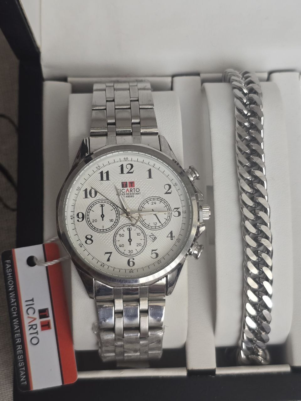 ست ساعت زنانه و مردانه کاسیو بند استیل ساعت ها دارای روزشمار دو عدد دستبند کارتیر استیل و دو تا انگشتر کارتیر (انگشتر طلایی و نقره ای و دورنگ موجود سایز ۶ تا ۱۰)