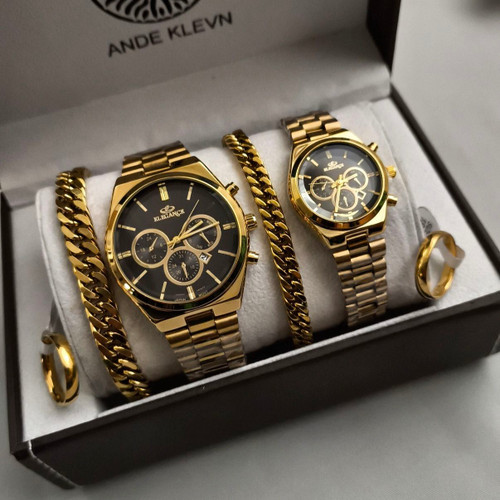 ست ساعت زنانه و مردانه الگانس بند استیل ساعت ها دارای روزشمار دو عدد دستبند کارتیر استیل و دو تا انگشتر کارتیر (انگشتر طلایی و نقره ای و دورنگ موجود سایز ۶ تا ۱۰)