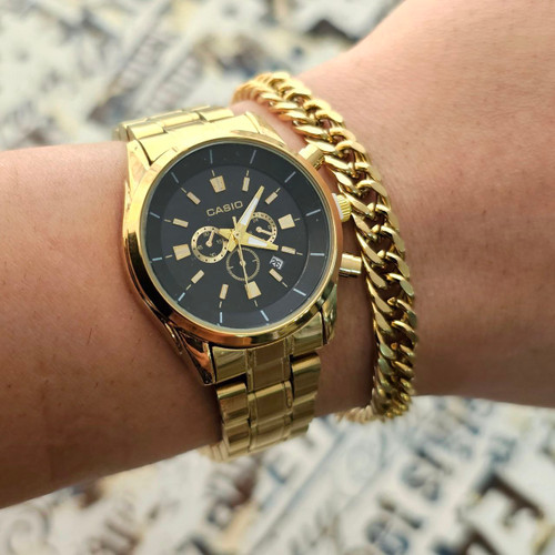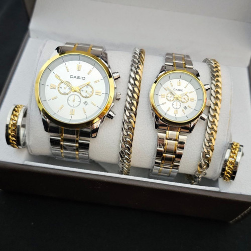 ست ساعت زنانه و مردانه کاسیو بند استیل ساعت ها دارای روزشمار دو عدد دستبند کارتیر استیل و دو تا انگشتر کارتیر (انگشتر طلایی و نقره ای و دورنگ موجود سایز ۶ تا ۱۰)