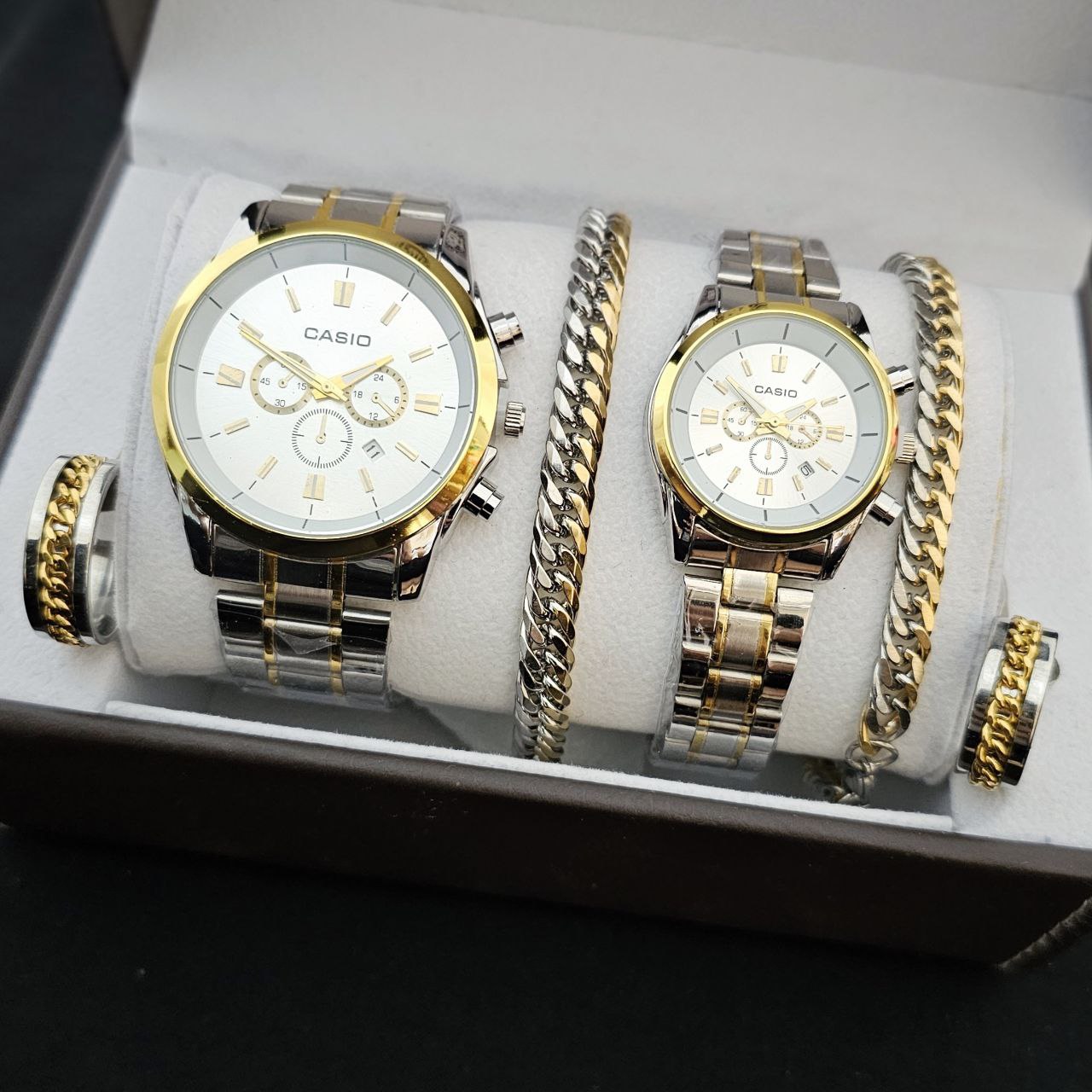 ست ساعت زنانه و مردانه برند کاسیو ساعت ها دارای روزشمار دو عدد دستبند کارتیر استیل و دو تا انگشتر