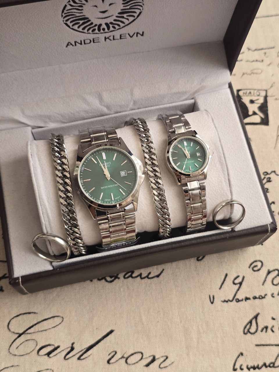 ست ساعت زنانه و مردانه کاسیو بند استیل ساعت ها دارای روزشمار دو عدد دستبند کارتیر استیل و دو تا انگشتر کارتیر (انگشتر طلایی و نقره ای و دورنگ موجود سایز ۶ تا ۱۰)