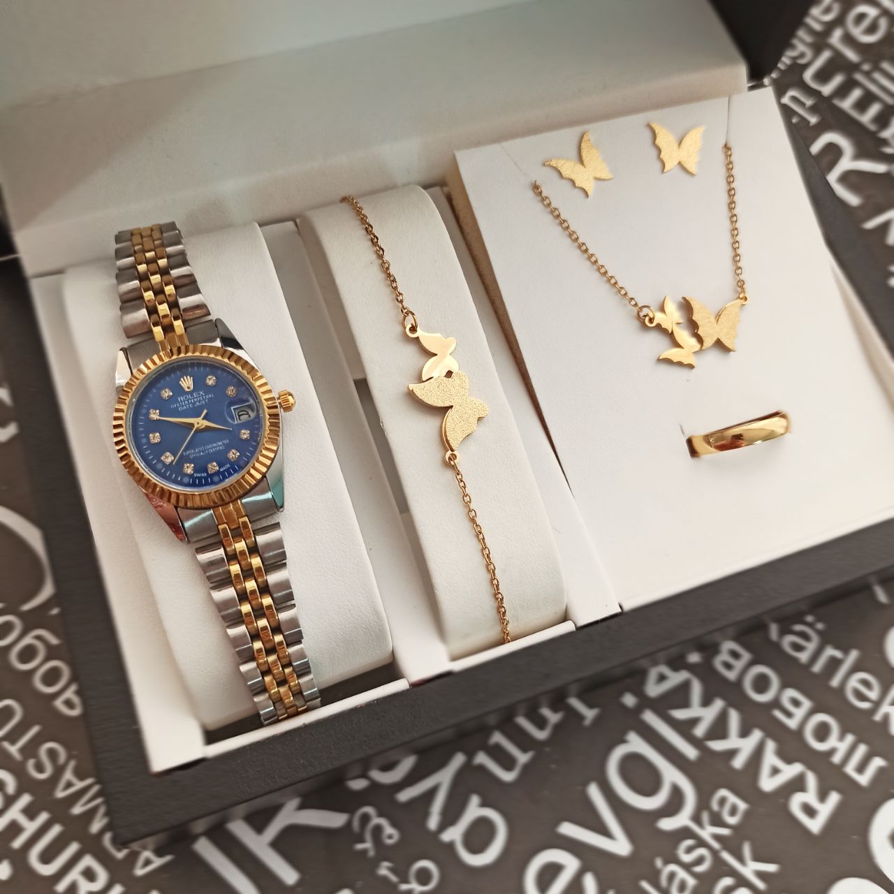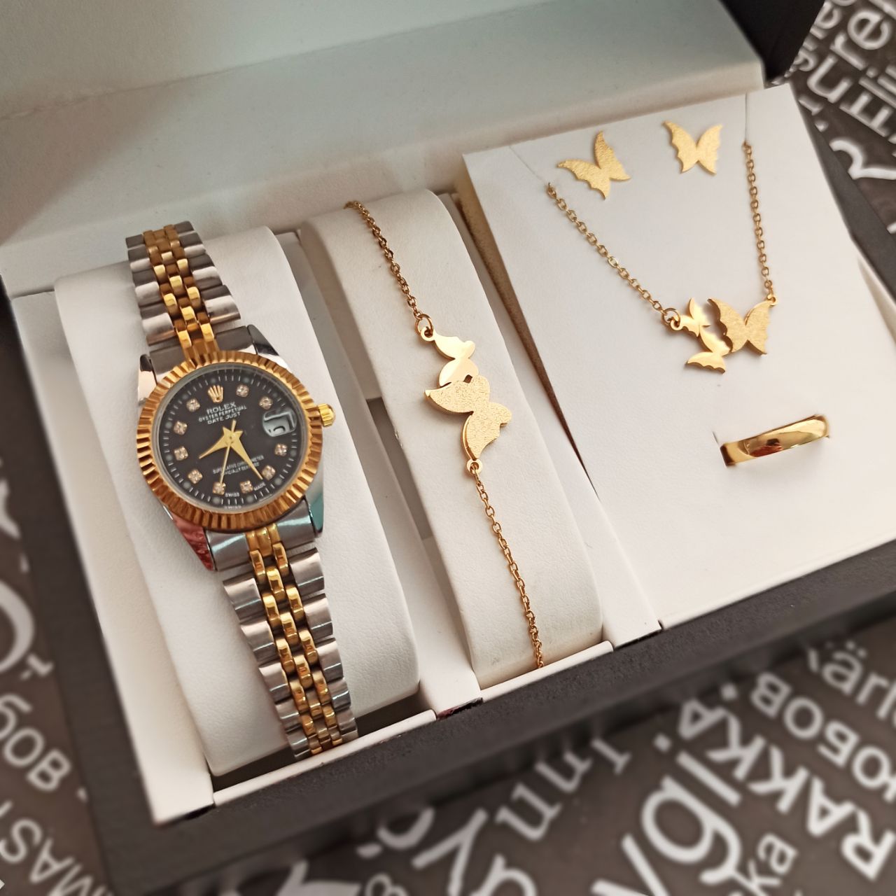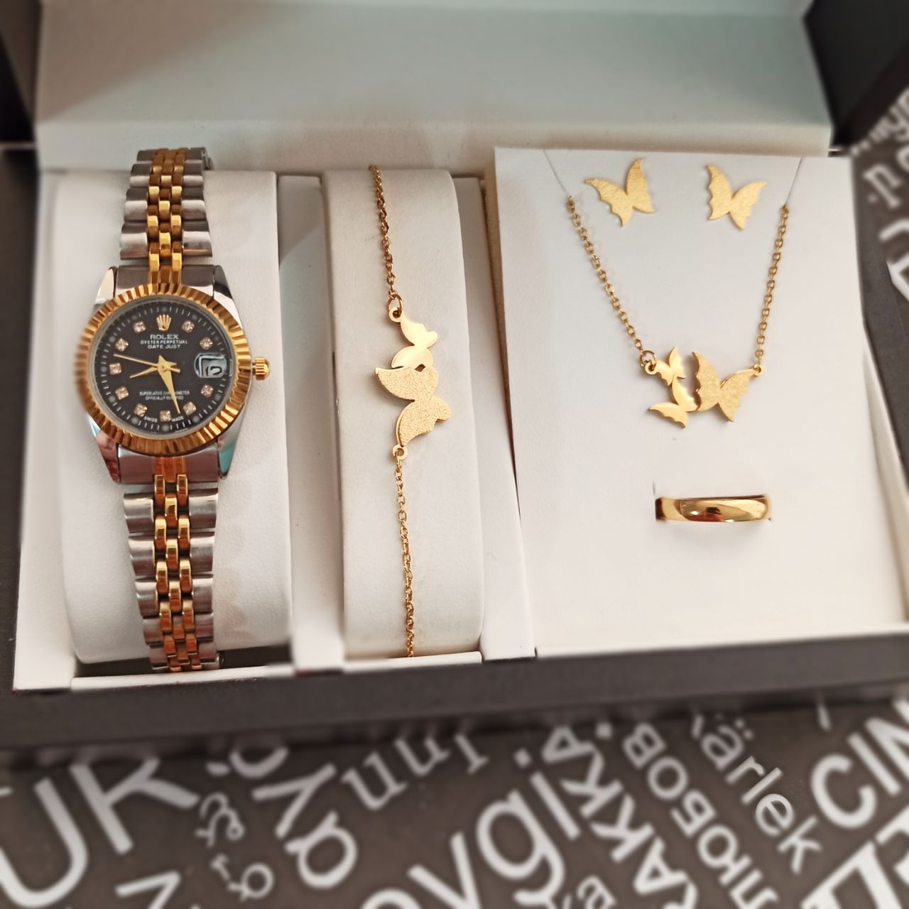 ست ساعت و دستبند و نیم ست استیل و رینگ (سایز 6 تا 10) ساعت دارای روزشمار بهمراه جعبه کادویی