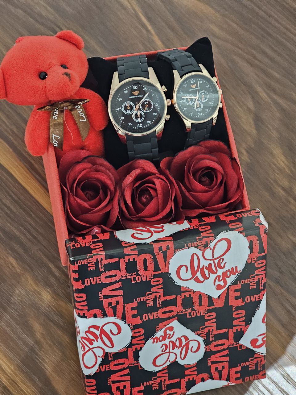 باکس هدیه دو عدد ساعت امپریو آرمانی بند فلزي با روکش سیلیکونی بهمراه جعبه و عروسک و گل