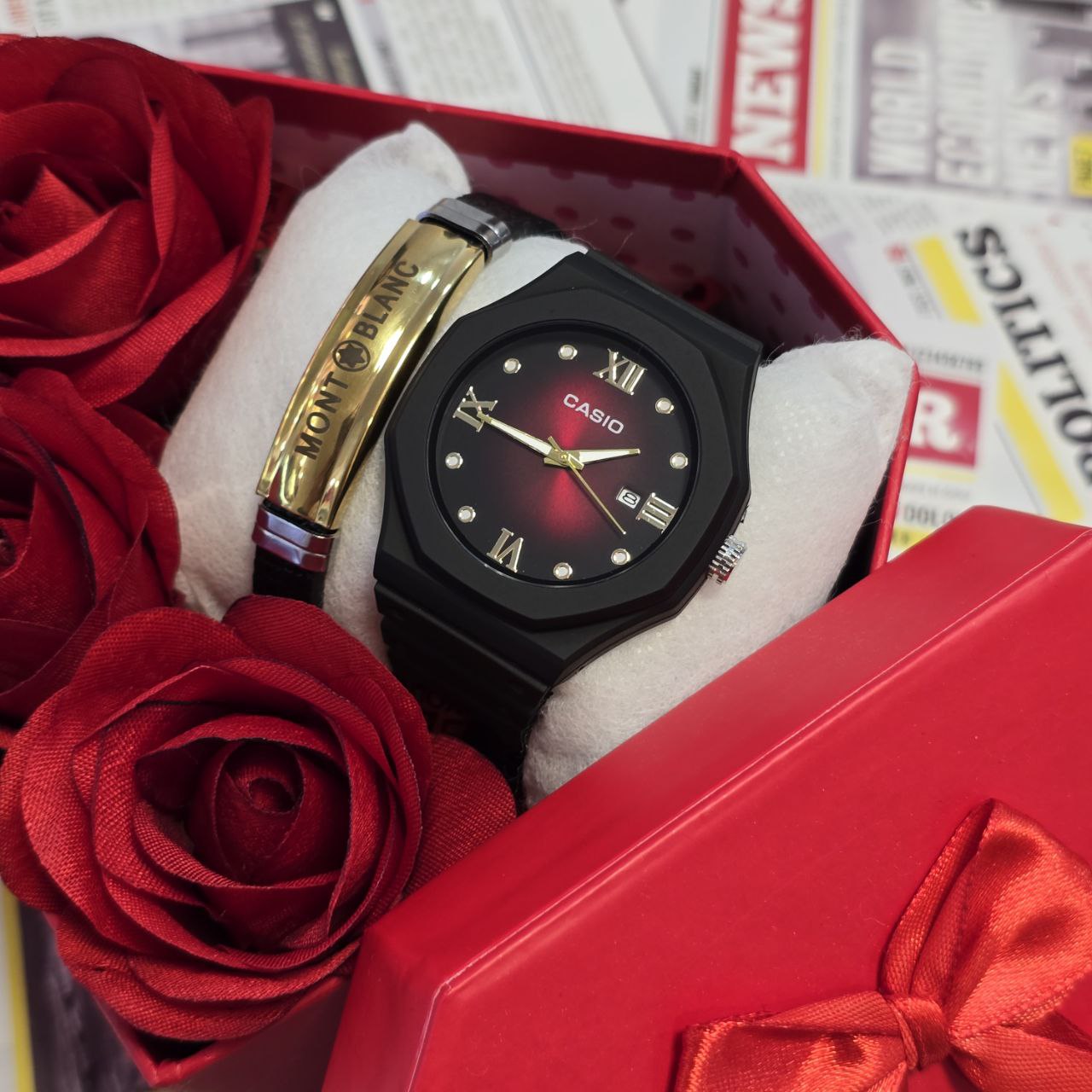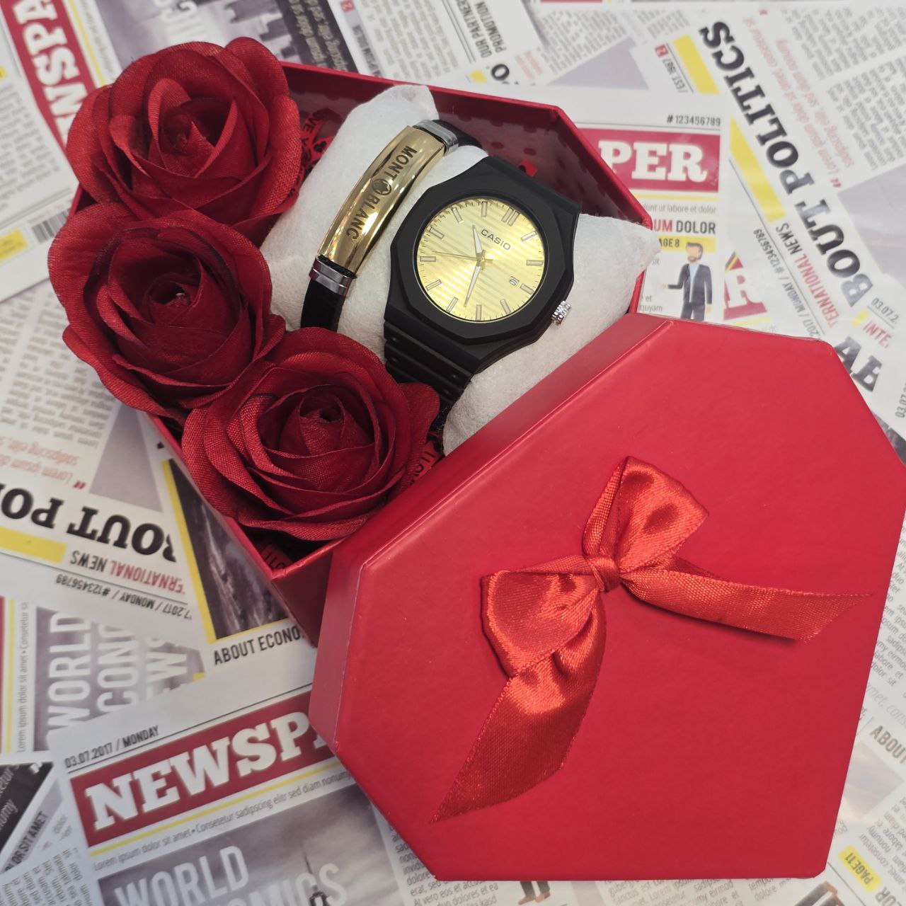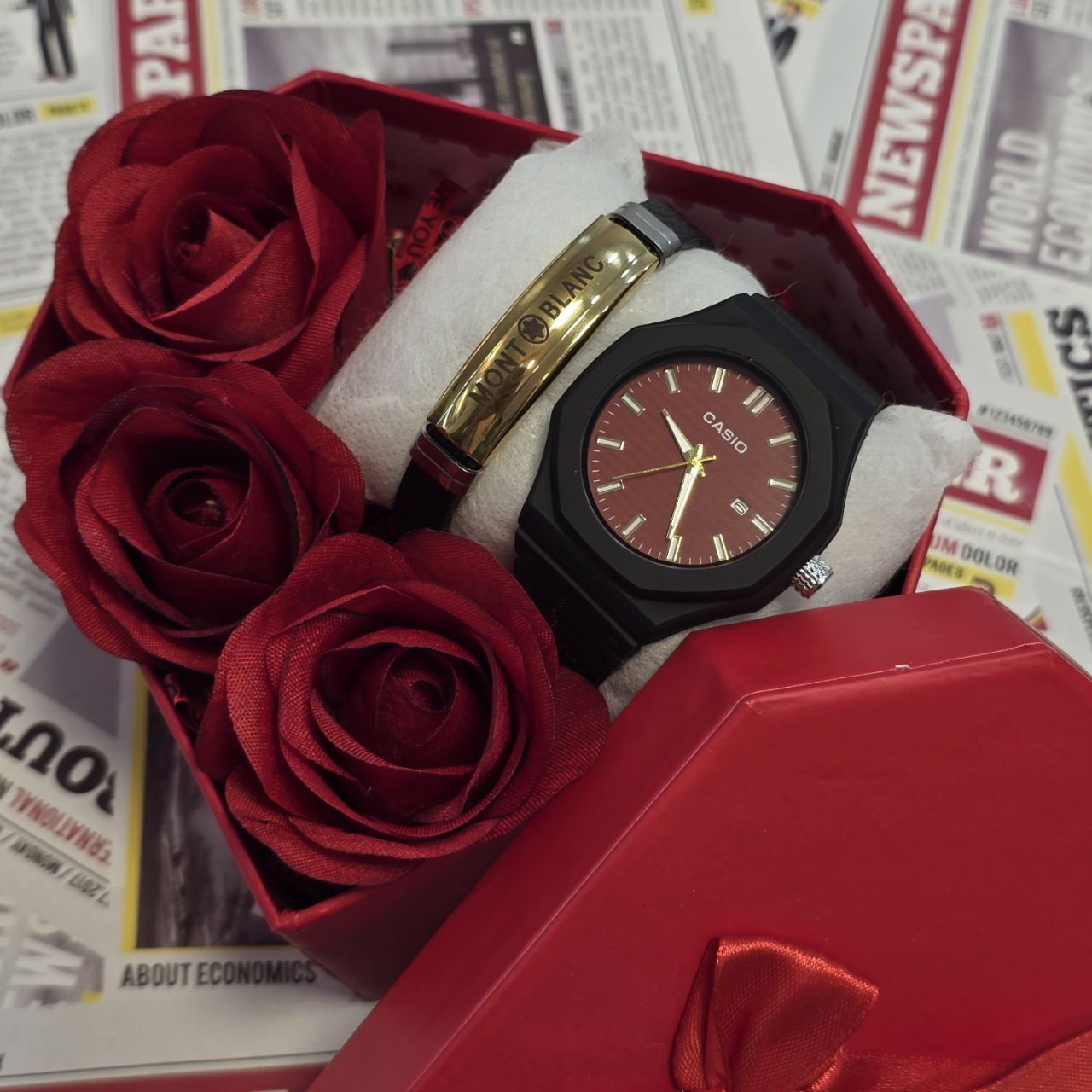 باکس هدیه مردانه ساعت کاسیو تقویم دار بهمراه دستبند و باکس