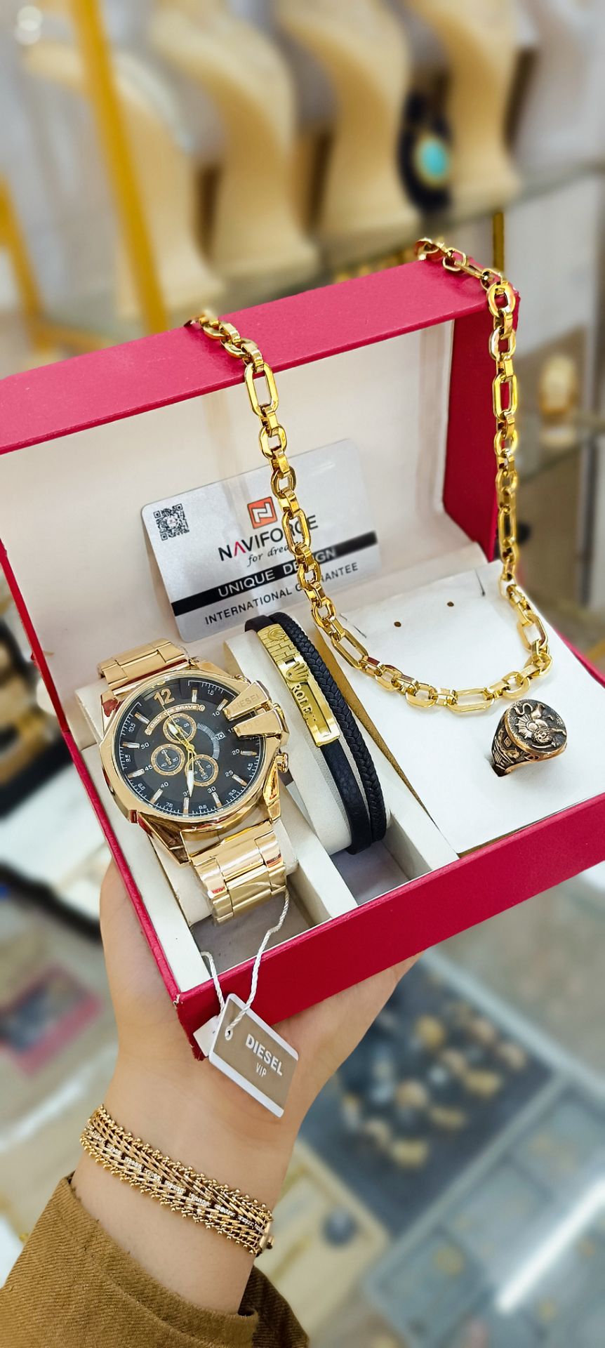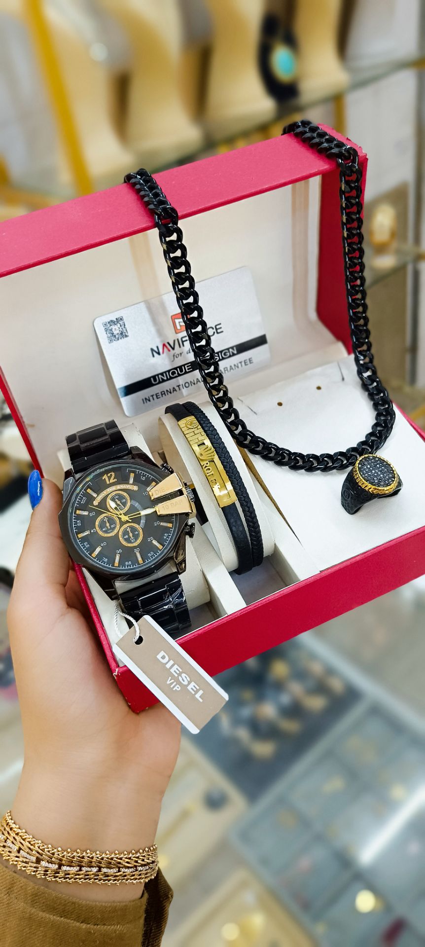 دارای: ساعت ودستبند وانگشتر وگردنبند