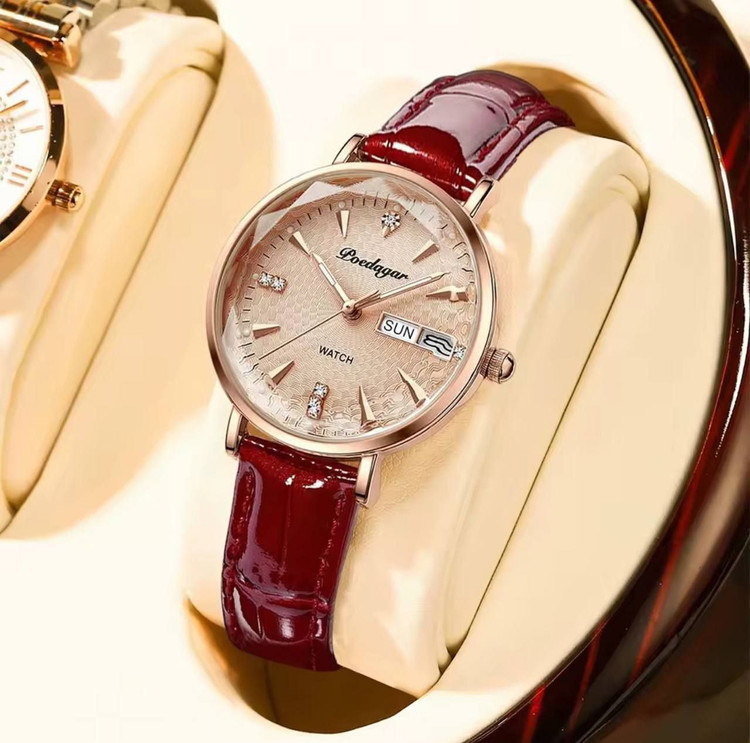 اطلاعات محصول :بند زرشکی قاب و صفحه رزگلد دارای روز شمار(روز های هفته و ماه) ضد اب (شست و شوی دست) موومنت کوارتز شیشه تراش بند چرمی قاب استیل رنگ ثابت