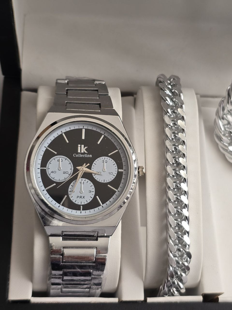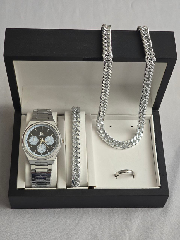 ست مردانه ساعت و دستبند و گردنبند زنجیر آلومینیومی و حلقه استیل( سایز ۶ تا ۱۰) بهمراه جعبه کادویی و باتری یدکی