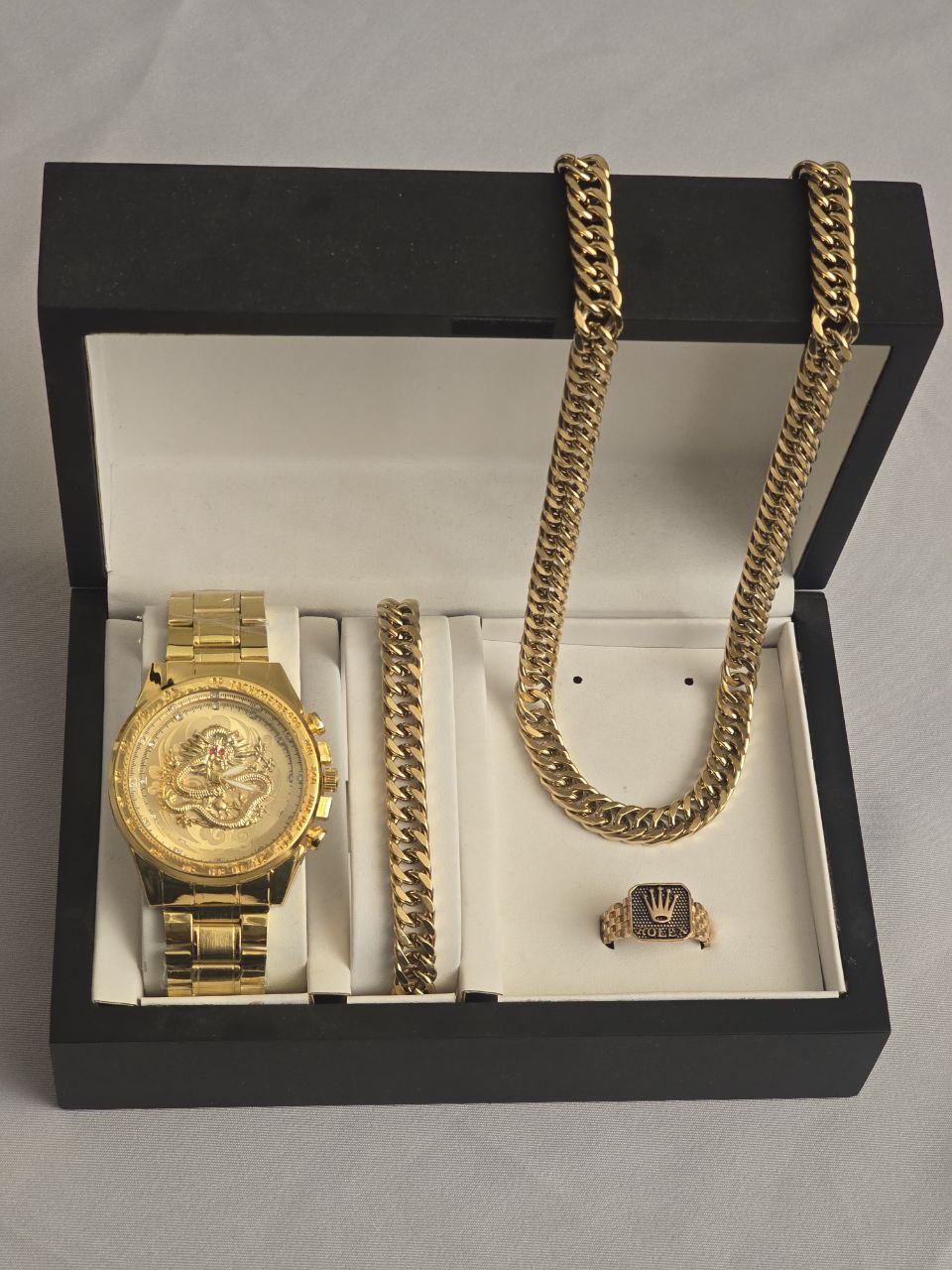 سایر مشخصات :: ست مردانه ساعت و دستبند و گردنبند استیل و حلقه( سایز ۶ تا ۱۰) بهمراه جعبه کادویی و باتری یدکی
