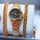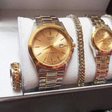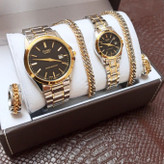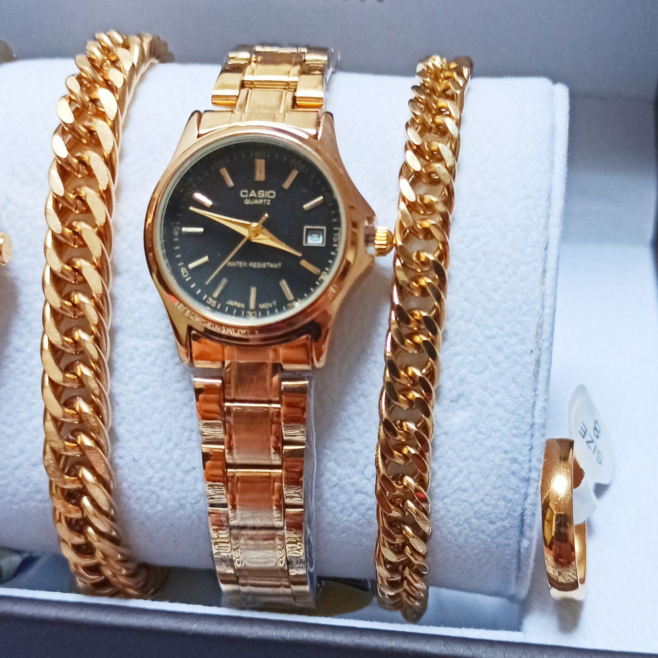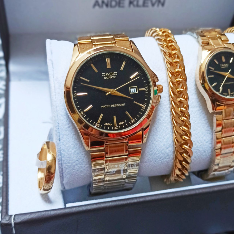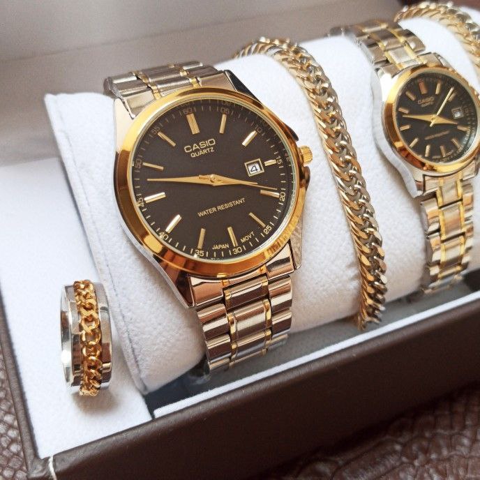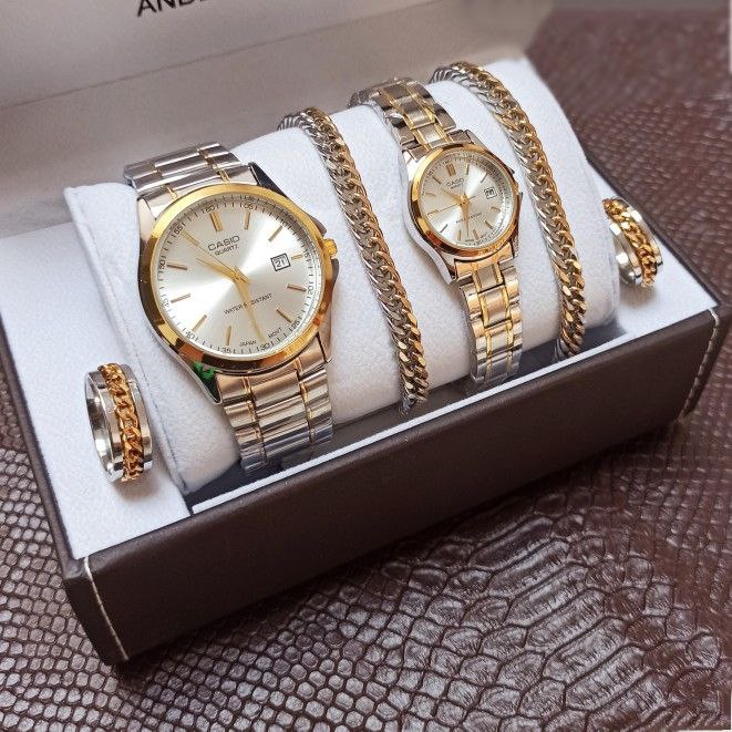 ست ساعت زنانه و مردانه برند کاسیو ساعت ها دارای روزشمار دو عدد دستبند کارتیر استیل و دو تا انگشتر به همراه جعبه کادویی
