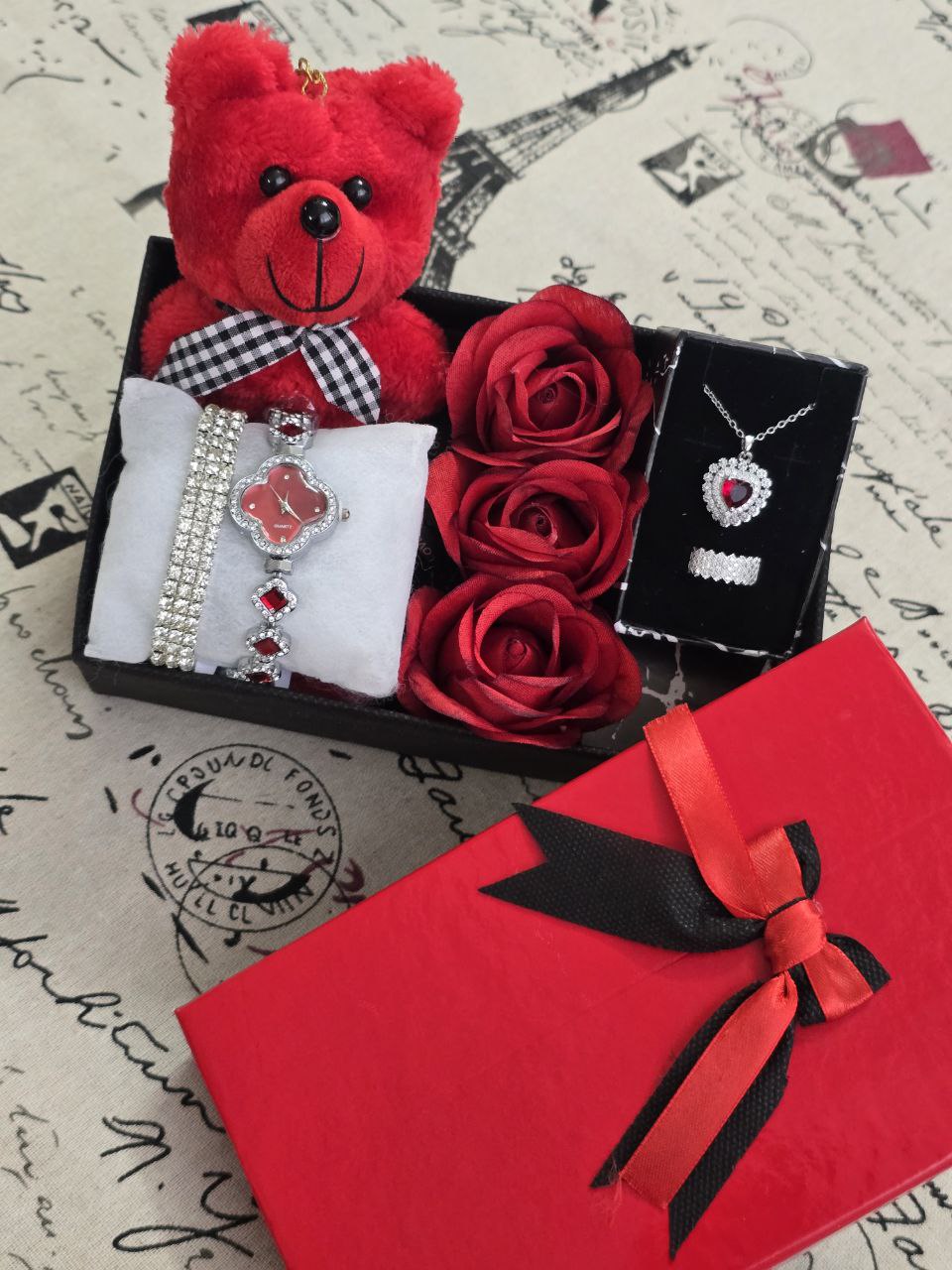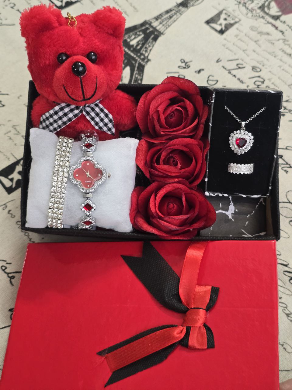 پک زنانه و دخترانه ساعت و دستبند و نیمست استیل و حلقه بهمراه باکس و عروسک و گل مصنوعی