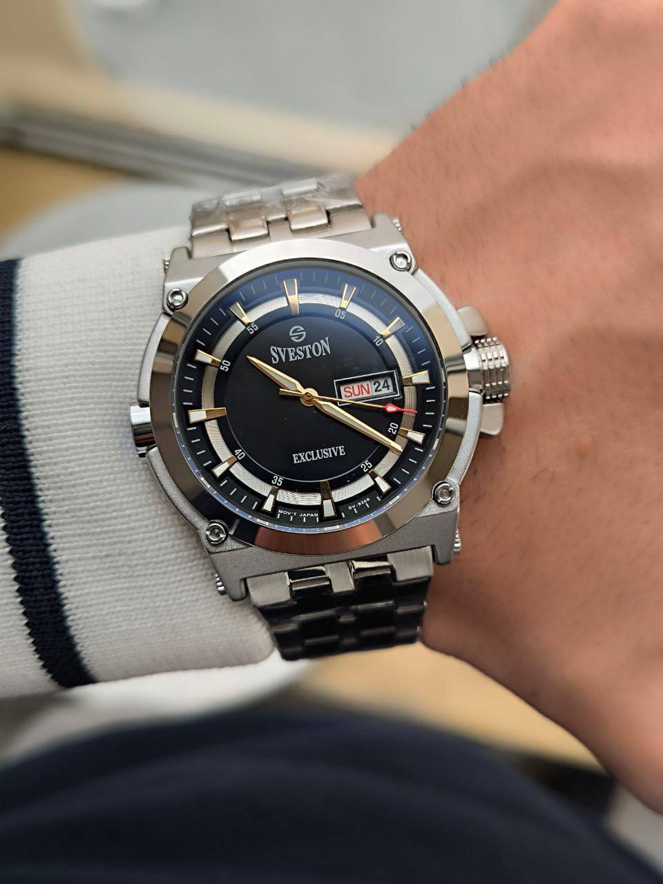 مشخصات: ساعت مردانه مارک SVESTON 185020006979 دو تاریخه ✅موتور ژاپن رنگ ثابت دوتقویم دار هک مارک روی قفل