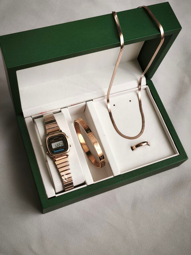 دارای: ساعت و دستبند و گردنبند و انگشتر