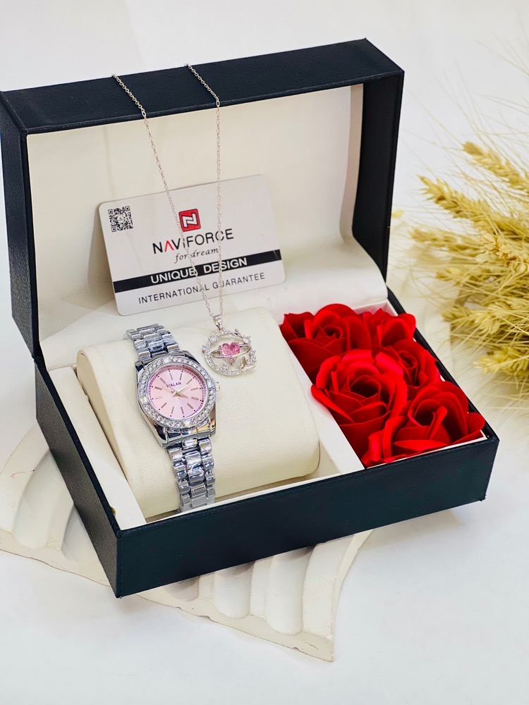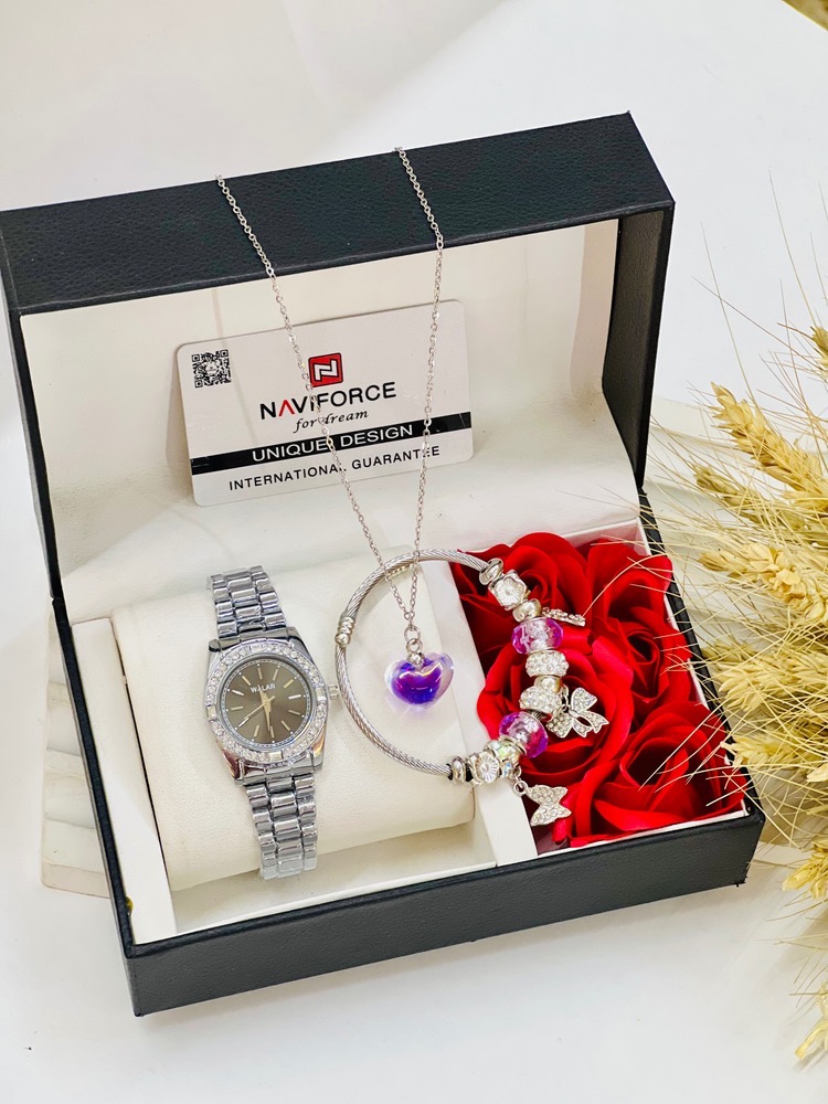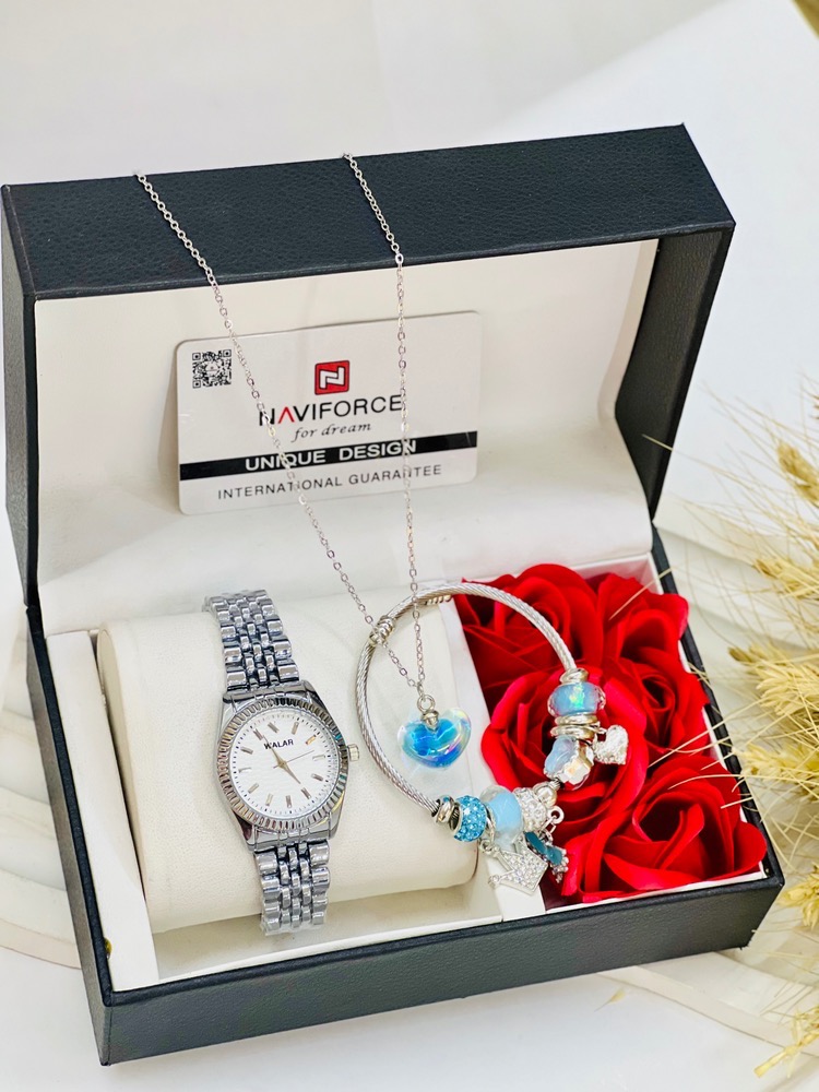 ست جدید زنانه همراه ساعت والار دستبند پاندورا گردنبد قلبی
