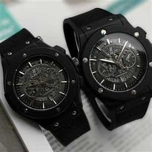ست ساعت زنانه و مردانه Hublot BigBang هابلوت طرح بیگبنگ موتور شرکتی دارای روزشمار بند رابر رویه مخملی حک شده آنتی آلرژی قاب فلزی مات قاب پشت استیل رنگ ثابت ضد آب 3ATM قفل استیل کلیپسی هابلوت