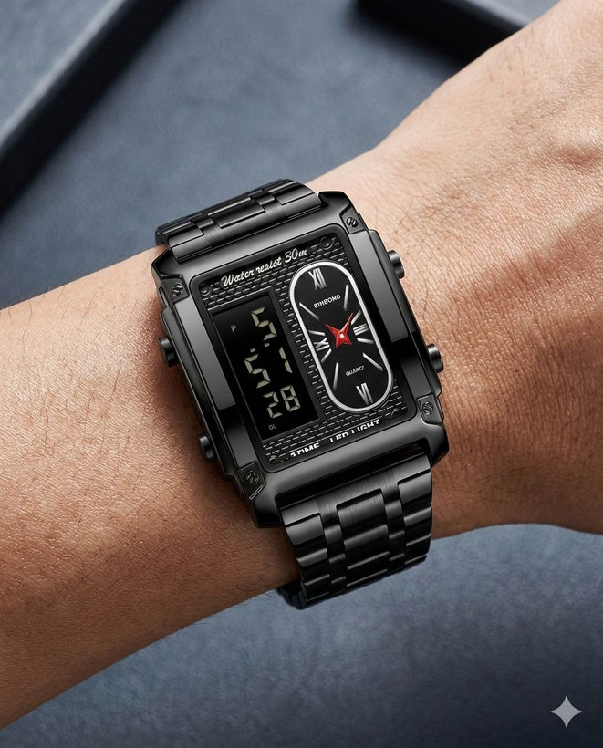 ساعت مچی مردانه کد 2330 تعداد محدود مردانه بوگاتی بین باند BINBOND مقاوم دربرابر آب دوزمانه برندشرکتی اوریجینال دارای روز شمار ایام هفته آلارم کرنومتر چراغ فسفری دیددرشب ضخامت ۱۴میل قطر صفحه ۵۰میل بند استیل فولاد شیشه رفلکس قفل کلیپسی موتور کوارتز