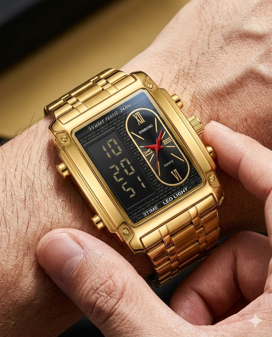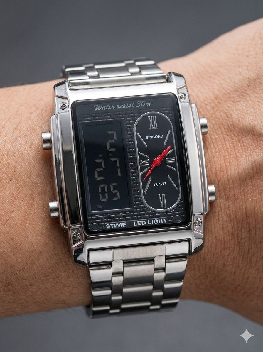 ساعت مچی مردانه کد 2330 تعداد محدود مردانه بوگاتی بین باند BINBOND مقاوم دربرابر آب دوزمانه برندشرکتی اوریجینال دارای روز شمار ایام هفته آلارم کرنومتر چراغ فسفری دیددرشب ضخامت ۱۴میل قطر صفحه ۵۰میل بند استیل فولاد شیشه رفلکس قفل کلیپسی موتور کوارتز