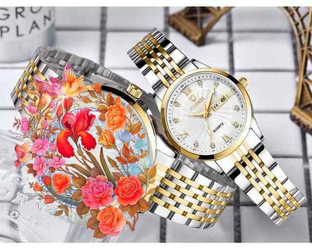 ست ساعت زنانه و مردانه الوز موتور کوارتز ضد آب در حد دست شستن طرح الماس دارای روز شمار ایام هفته صفحه شب نما بند وستاری قفل پروانه ای استیل مخفی شیشه سافایر ضدخش