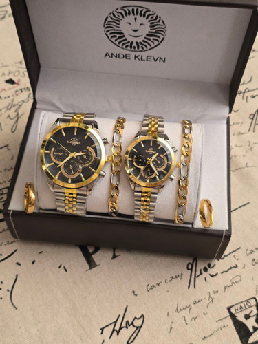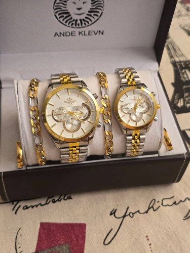 ست ساعت زنانه و مردانه برند کاسیو ساعت ها دارای روزشمار دو عدد دستبند کارتیر استیل و دو تا انگشتر به همراه جعبه کادویی
