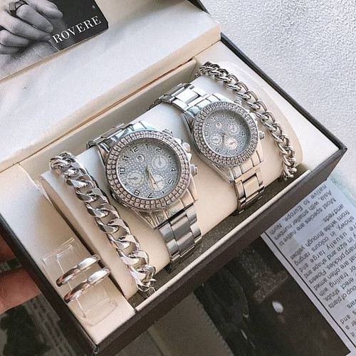 ست ساعت زنانه و مردانه برند کاسیو ساعت ها دارای روزشمار دو عدد دستبند کارتیر استیل و دو تا انگشتر به همراه جعبه کادویی