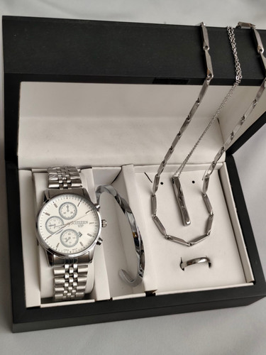 ست مردانه ساعت و دستبند و گردنبند استیل و حلقه بهمراه جعبه کادویی و باتری یدکی