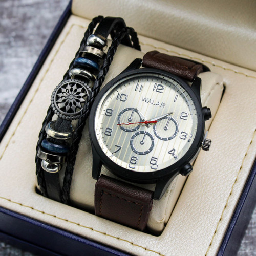 ست ساعت و دستبند مردانه WALAR ✅طرح کرنو، بند چرمی ✅جعبه کادویی و باطری رایگان