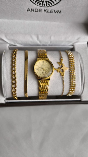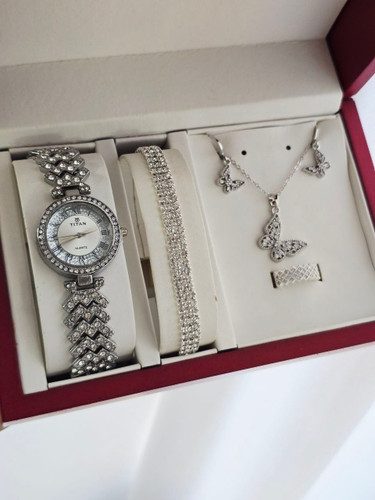 ست مجلسی زنانه و دخترانه ساعت و دستبند و نیمست و انگشتر بهمراه جعبه کادویی و باتری