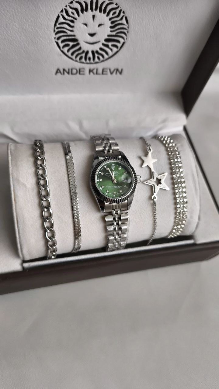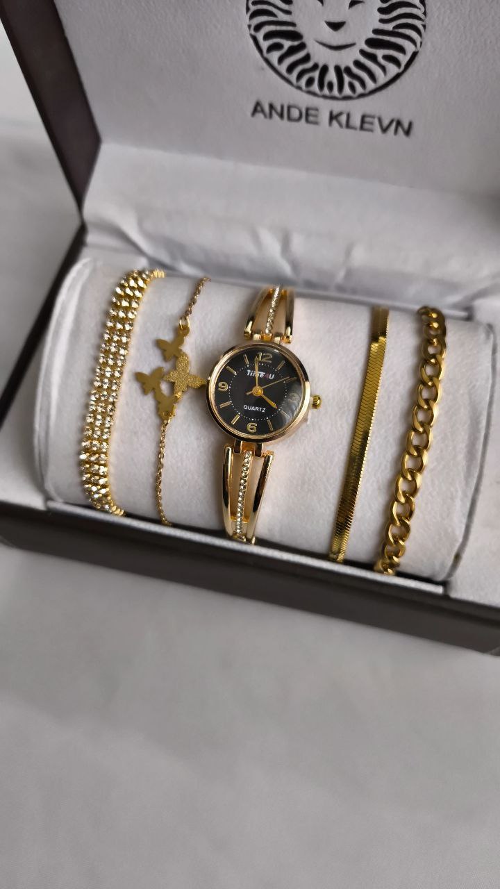 ست مجلسی زنانه و دخترانه ساعت و دستبند و نیمست و انگشتر بهمراه جعبه کادویی و باتری
